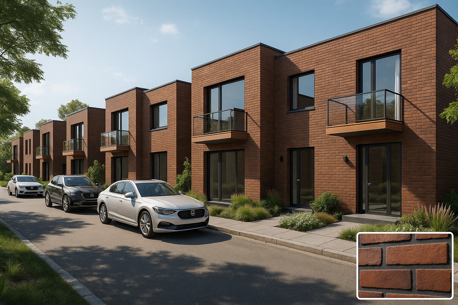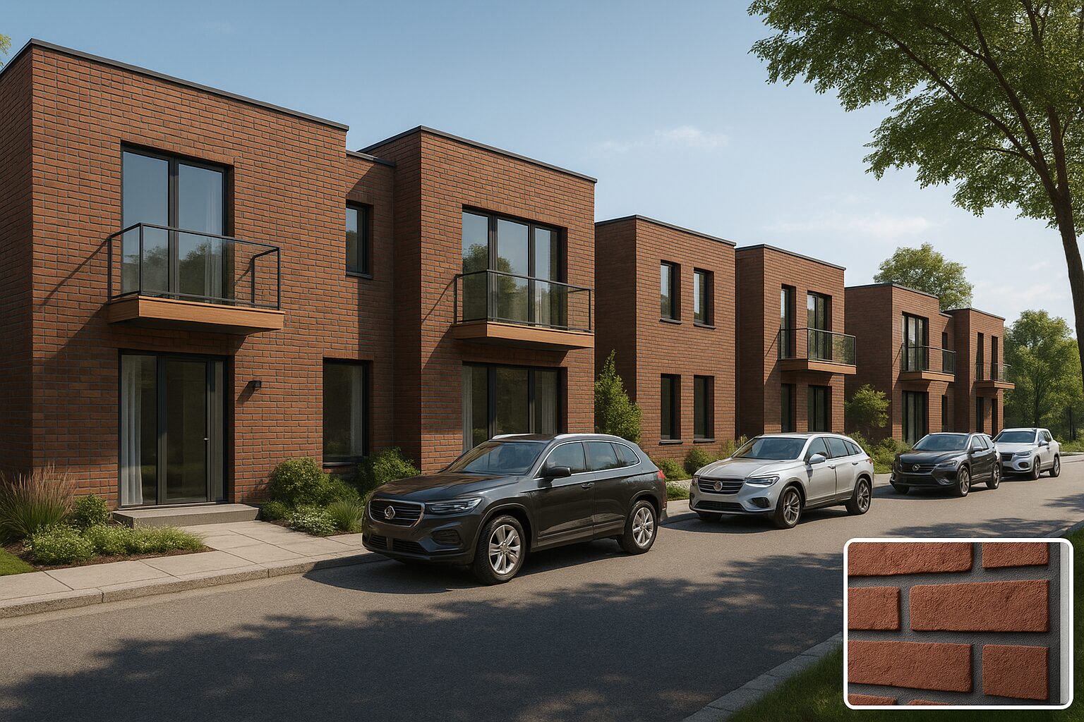 Admirați combinatia distinctivă de cărămidă aparentă clasică roșie și rosturi gri antracit în această casă modernă. Un design exterior impresionant care promite o primire călduroasă și un stil de viață sofisticat.